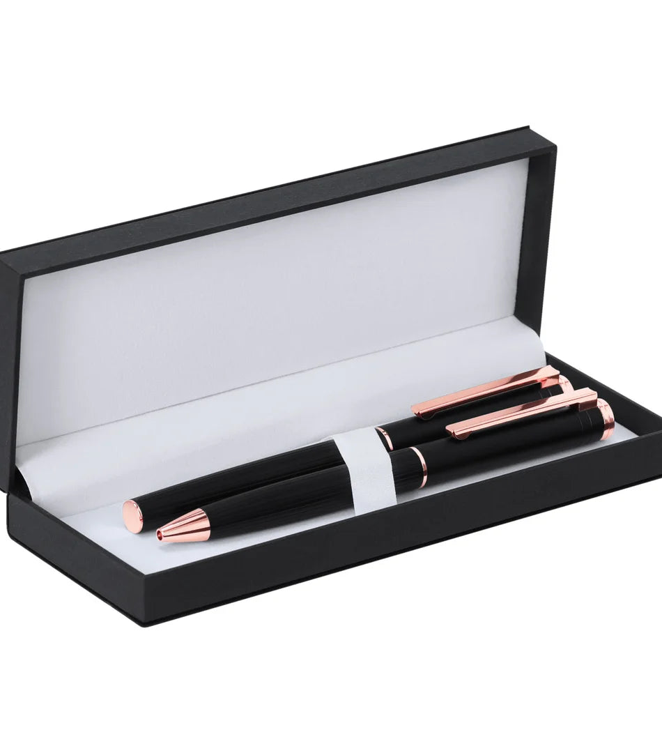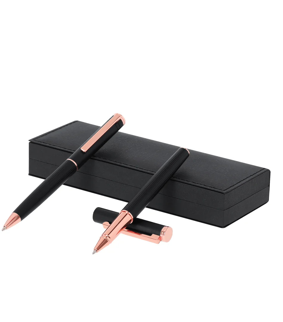 Distinctive ball pen and roller pen set, both designed with elegantmatte black aluminum bodies and rose gold decorative elements. Textured barrel for easy grip and metal clip. Ball pen with twist mechanism and rollerball pen with cap, both in blue ink and with jumbo cartridge. Presented in a sophisticated, black leather-look case, white inside. Pen and Roller. Jumbo Refill