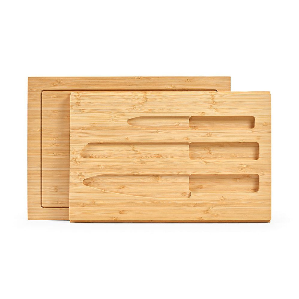 Our remarkable Bamboo Board is not only a functional cutting surface but also a cleverly designed kitchen accessory. Measuring 28 x 39 x 4.5 cm, this board features a groove encircling its perimeter, ideal for catching crumbs or juices and keeping your workspace clean. The unique aspect of this board lies in its hidden feature – a sliding tray that neatly houses three kitchen knives. This innovative design ensures that your essential cutting tools are always within reach, neatly stored, and organized. Presented in an individual recycled cardboard box, this bamboo board is an eco-friendly choice, reflecting a commitment to sustainability without compromising on functionality and convenience. Whether you're chopping vegetables, slicing meat, or preparing a cheese platter, this bamboo board with its integrated knife storage is a practical and stylish addition to any kitchen, perfect for those who appreciate efficiency and thoughtful design.