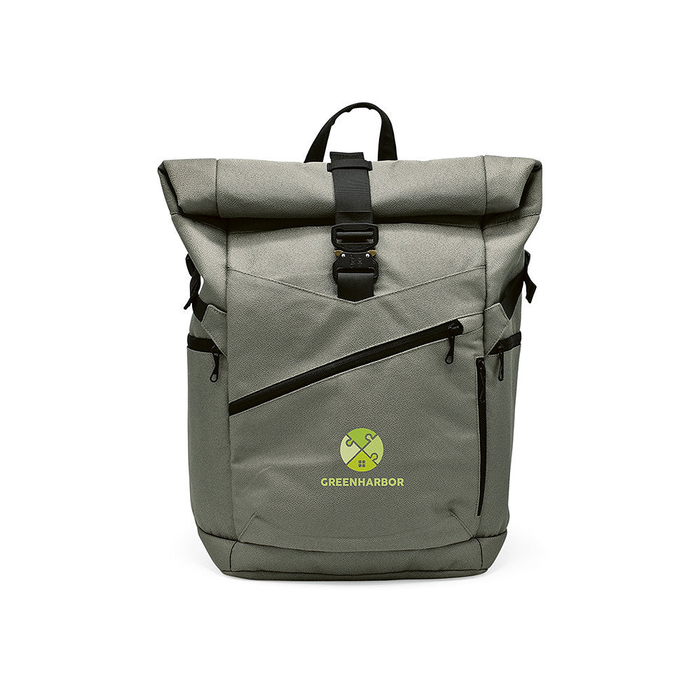 Meticulously designed, our 28L backpack features rPET. It boasts a high-quality roll top buckle closure. On the padded back you will find a trolley strap and a hidden pocket. Reinforced handle and straps. Individually packaged in recycled polybag.