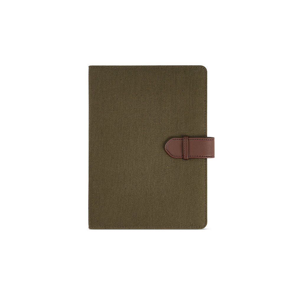 Our eco-friendly recycled cotton canvas A5 folder boasts a convenient recycled PU snap closure, a pad of 64 FSC dotted pages (70 gsm), a phone pocket, a double pen holder and card slots. Crafted for sustainability, it's your stylish companion for success.