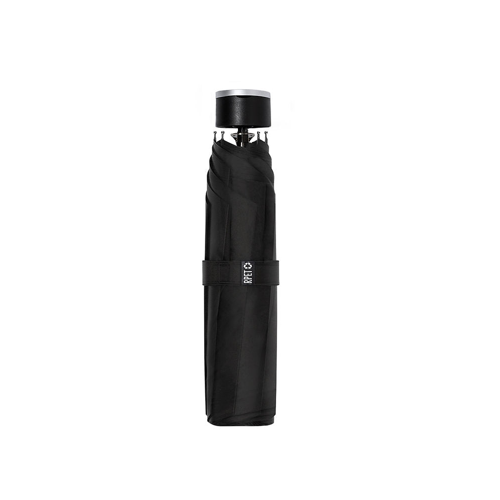 Stylish premium set including: Recycled stainless steel double-layer thermos bottle with matte black finish and 500ml capacity. Matte silver metal handle, With stainless steel badge. RPET notepad in elegant black, with special metal detail for laser branding. Including elastic bands and fabric bookmark. Inside with 80 sheets, single-stripe layout. With RPET logo. 98 cm diameter folding umbrella in black color. Made in 190T RPET pongee material. Manual opening, with windproof mechanism and fiberglass ribs. With carrying sleeve and matching straps. With distinctive RPET label. RPET ball pen with matt black finish, twist mechanism and blue ink. The RPET material is made from recycled plastic to encourage the reuse of plastic waste and help the sustainability of the planet. Set presented in an individual matte-finish, case with inside die cut for each of the elements of the set.