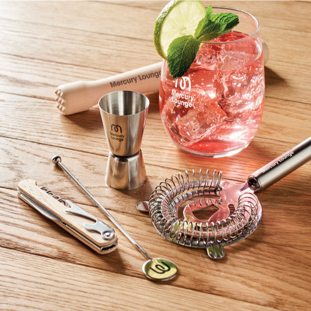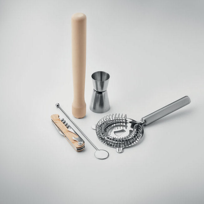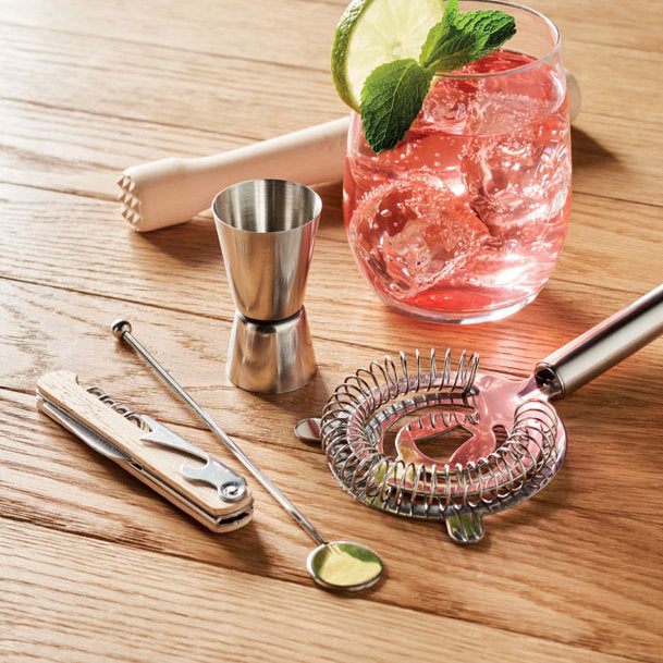 Elevate your mixology game with our Cocktail Kit, elegantly packaged in a cotton pouch with a drawstring. This 5-piece set includes a double-sided measuring jigger (15 & 30 ml), a wooden muddler, a cocktail strainer, a drink stirrer, and a waiter's corkscrew knife. Perfect for crafting the perfect cocktail at home or on the go.