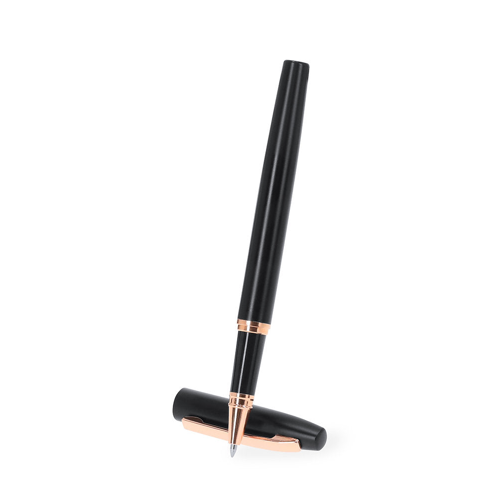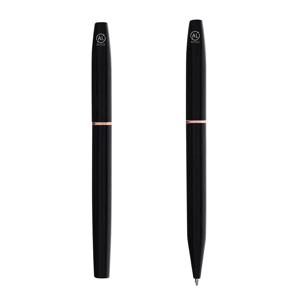 Ball pen and roller pen set made of Recycled Aluminium, in elegant matte black design with distinguished pink gold fittings. Twist mechanism ball pen and roller pen with cap, both with metal clip. In blue ink and with Recycled Aluminium logo. Presented in an elegant black case. Recycled Aluminium is a material with almost infinite recycling possibilities, without losing its original properties and consuming less energy in the process. GRS (Global Recycled Standard) certification, guaranteeing the recycled origin of the material used to manufacture the product. Pen and Roller