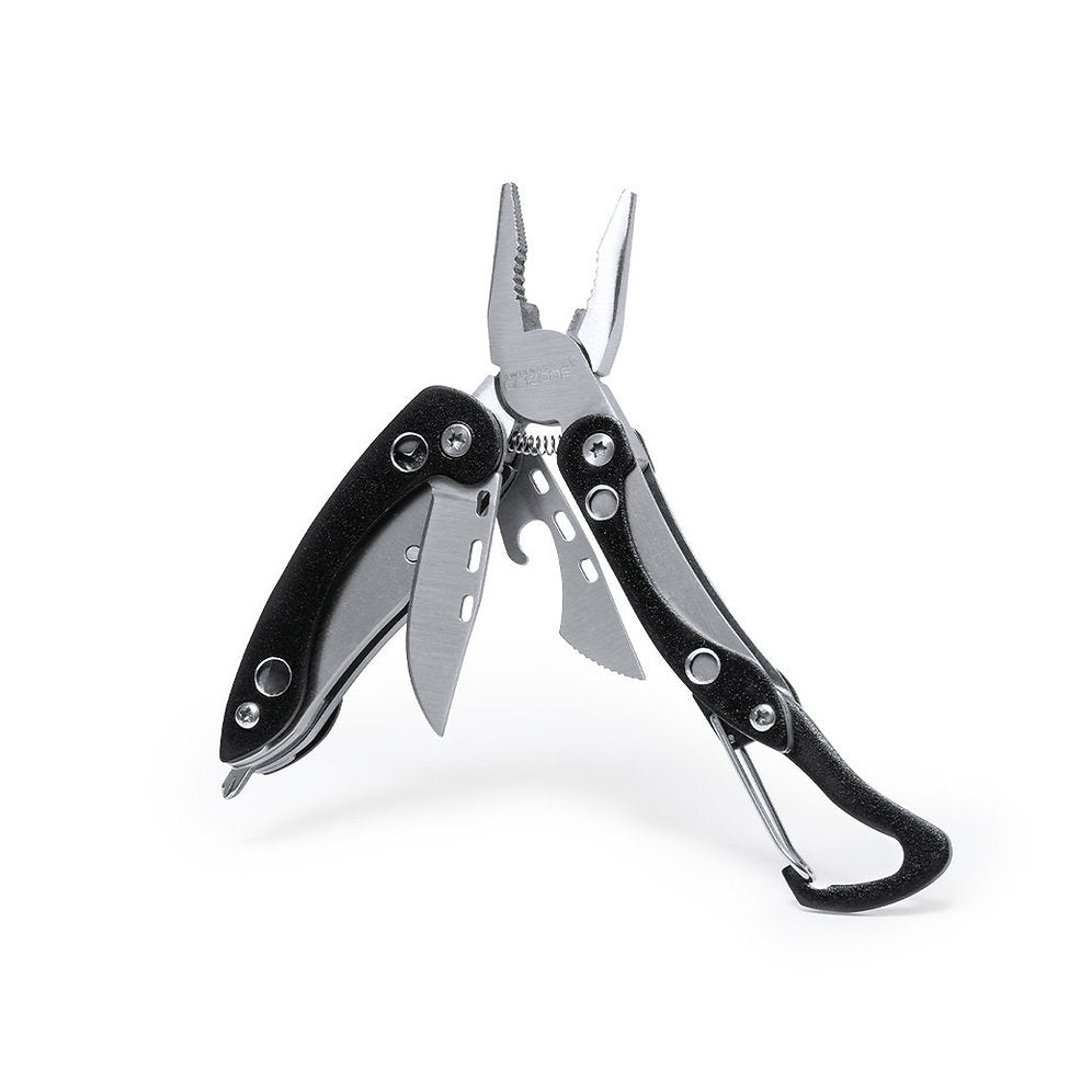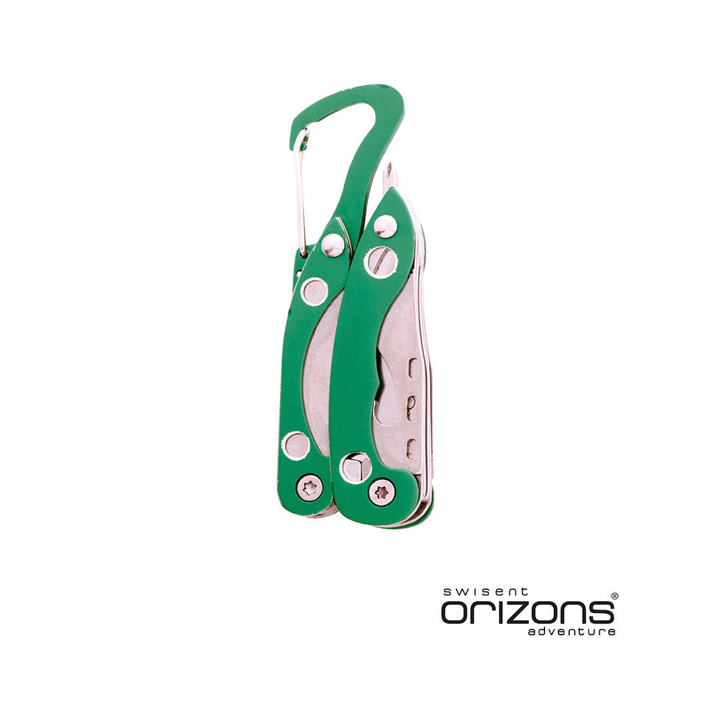 Multi-tool by Orizons with stainless steel accessories of 6 functions and aluminum handle in bright tones. With pliers, razor, can opener with flat-head screwdriver with bottle opener function, star tip detonator and carabiner. Presented in an attractive design box with the brand logo. 6 Functions