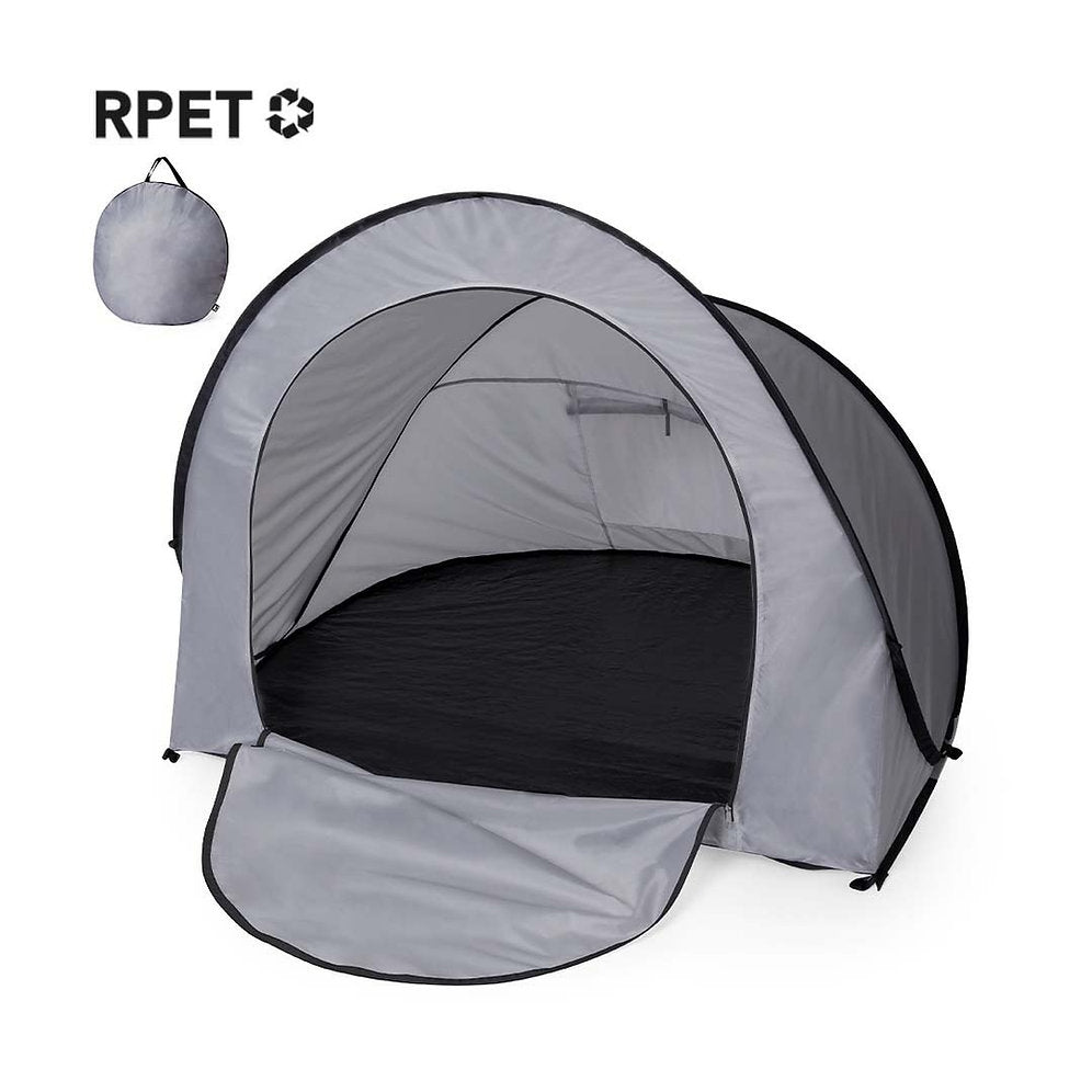 Introducing our innovative self-assembly tent, designed for effortless setup to enhance your camping experience. This tent redefines convenience; simply remove it from its cover, and watch it unfold automatically, thanks to its metal structure with sleek black details. Crafted from durable RPET polyester, it combines resilience with an eco-conscious approach, supporting the sustainability of our planet by repurposing recycled plastic. Featuring a wide entrance door equipped with a zip closure that includes double inside and outside zip pullers, this tent ensures easy access and security. The back window, complete with a mosquito net, velcro fastening, and a roll-up curtain with string and fastening strap, offers ventilation and protection from insects. Designed to comfortably accommodate 2 people, it's also remarkably easy to fold back into its compact form. Presented in a matching RPET polyester pouch, with an outside label highlighting the RPET distinctive, this tent not only offers practicality and durability but also stands as a testament to environmental responsibility. Perfect for outdoor enthusiasts who value convenience and sustainability.