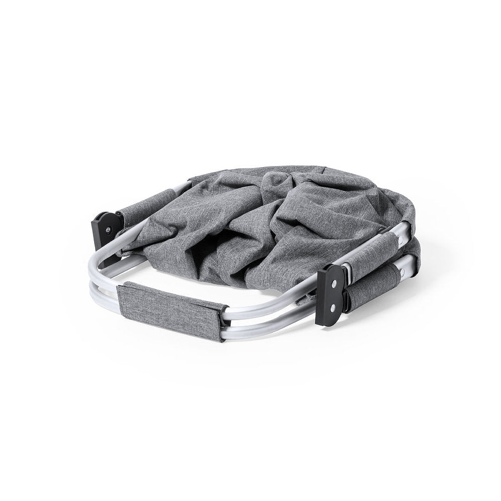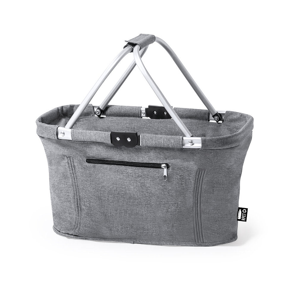 Foldable basket made of durable 600D RPET. With resistant aluminium frame and 2 foldable aluminium carrying handles, with matching velcro strap. Outside pocket with zip closure and outside label with the RPET distinctive.