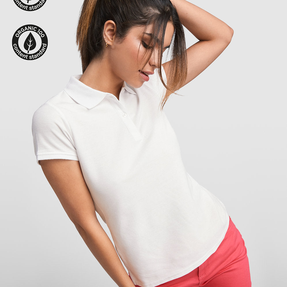 Fitted short-sleeve polo shirt for women in OCS certified organic cotton. 1x1 ribbed collar and sleeve edging. 2-button placket. Reinforced covered seams in collar. Side slits on hem.