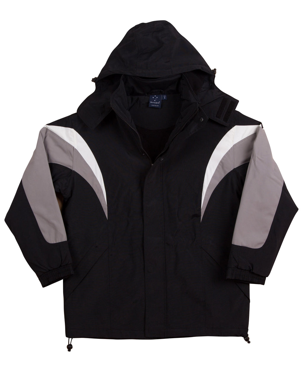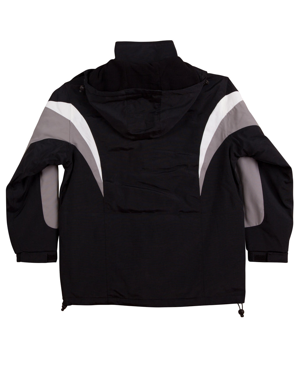 Description: Contrast jacket with double stitched seams across back and front. djustable cuffs with velcro tabs. Front pockets on both sides. Draw-cord at hem .Inside garment features: chest jet pocket,self-phone pouch,pen holder & an extra big pocket at the lower waist position. Concealed zippered embroidery access.