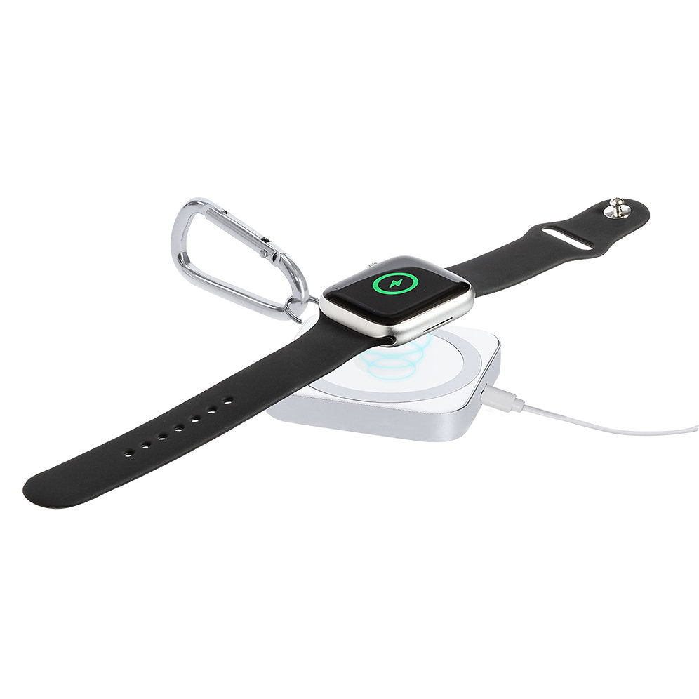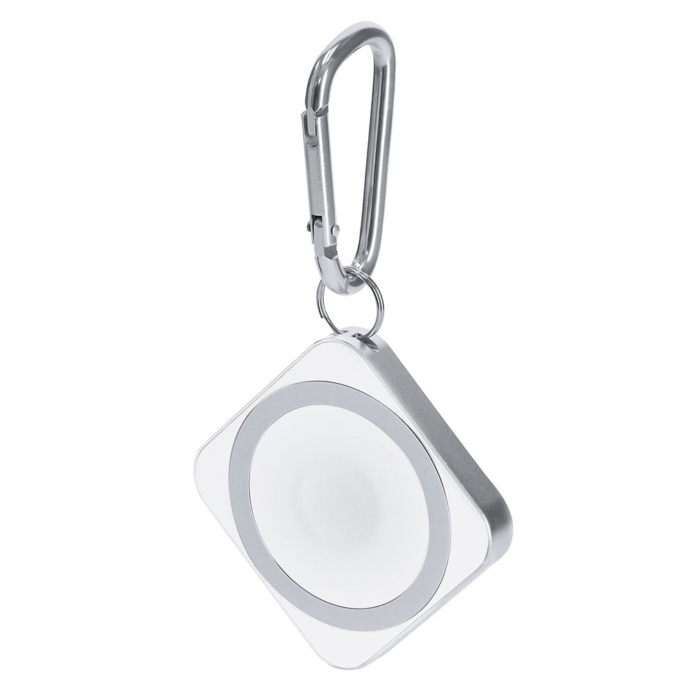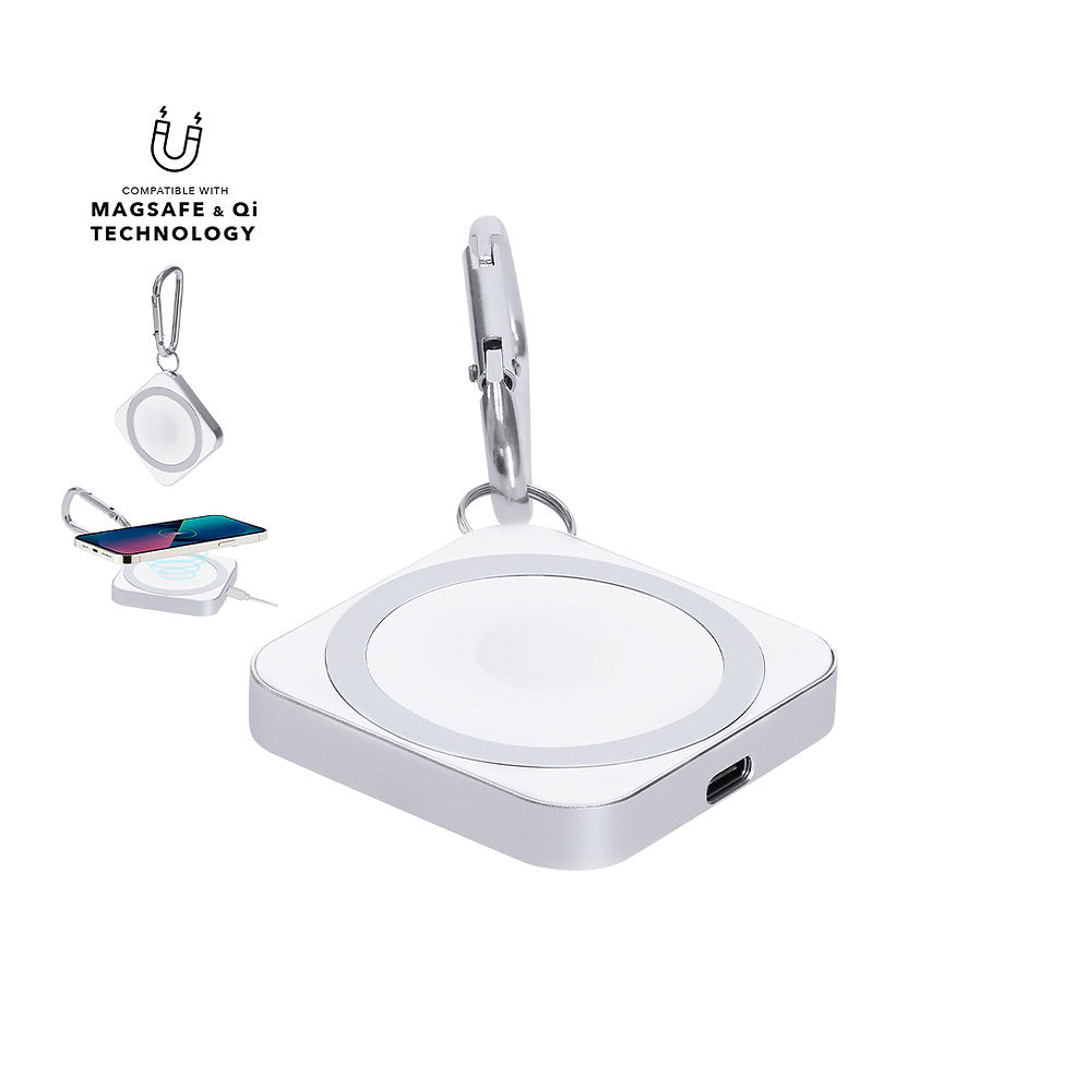 15W wireless charger made of aluminium. Designed for charging smartphones, earphones and smartwatches. With magnetic attachment. It includes metal carabiner for transport. Type C connection.